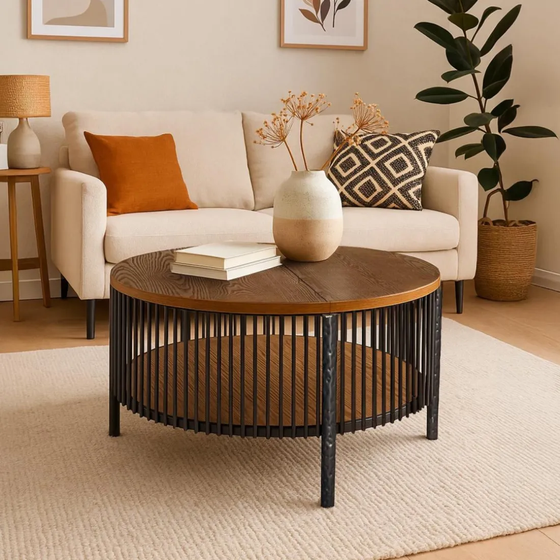 La table basse ronde avec rangement de la marque 3S. x Home est une pièce authentique qui promet de donner du cachet à votre espace. Sa couleur Bois apporte une touche naturelle et chaleureuse. Elle mesure 41.5 cm de hauteur et 84.2 cm de large pour s’adapter parfaitement à votre salon. Conçue en bois pour le plateau principal et en métal pour le pied et la structure de rangement en dessous, elle allie robustesse et élégance. Son détail unique réside dans la mareté noire qui accentue son aspect authentique. Cette table basse n’est pas simplement un meuble, c’est aussi un bel objet de décoration.