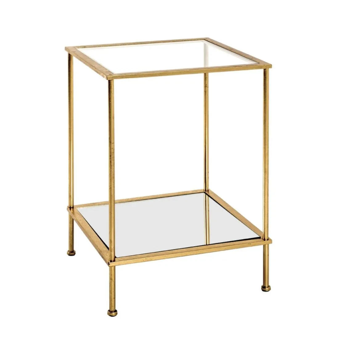Tube d’acier laqué or, plateau de dessous en miroir, plateau de dessus en verre trempé transparent