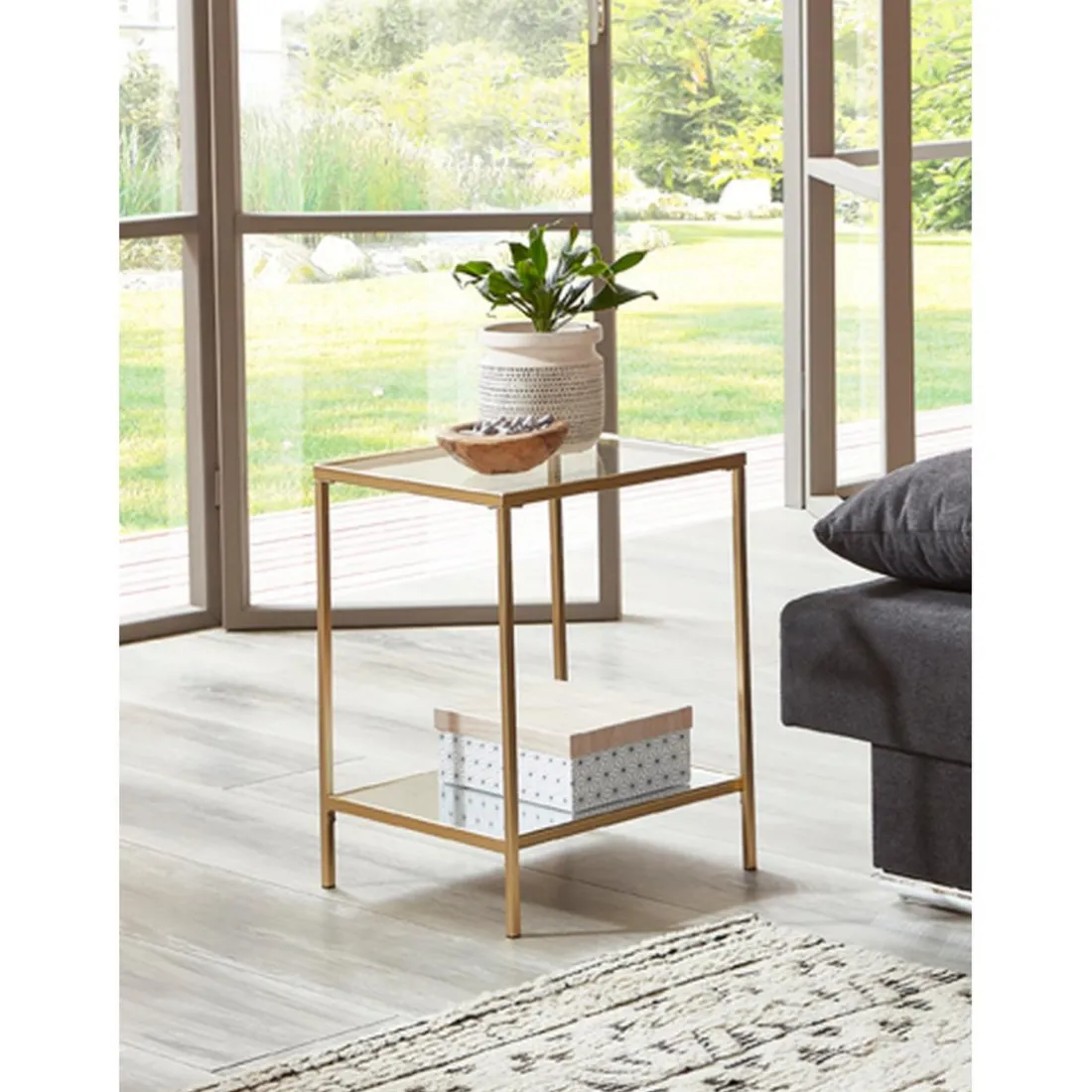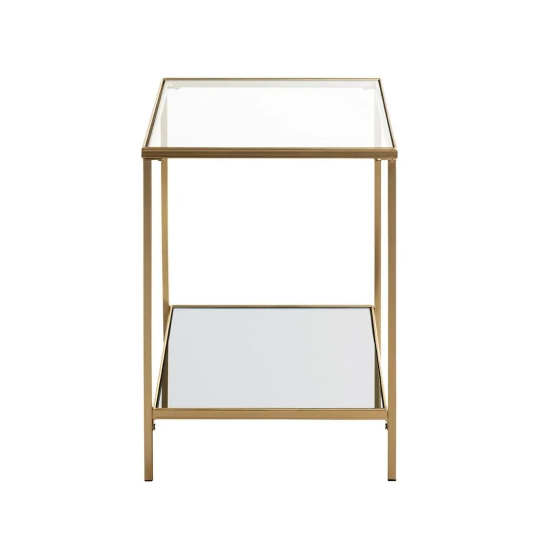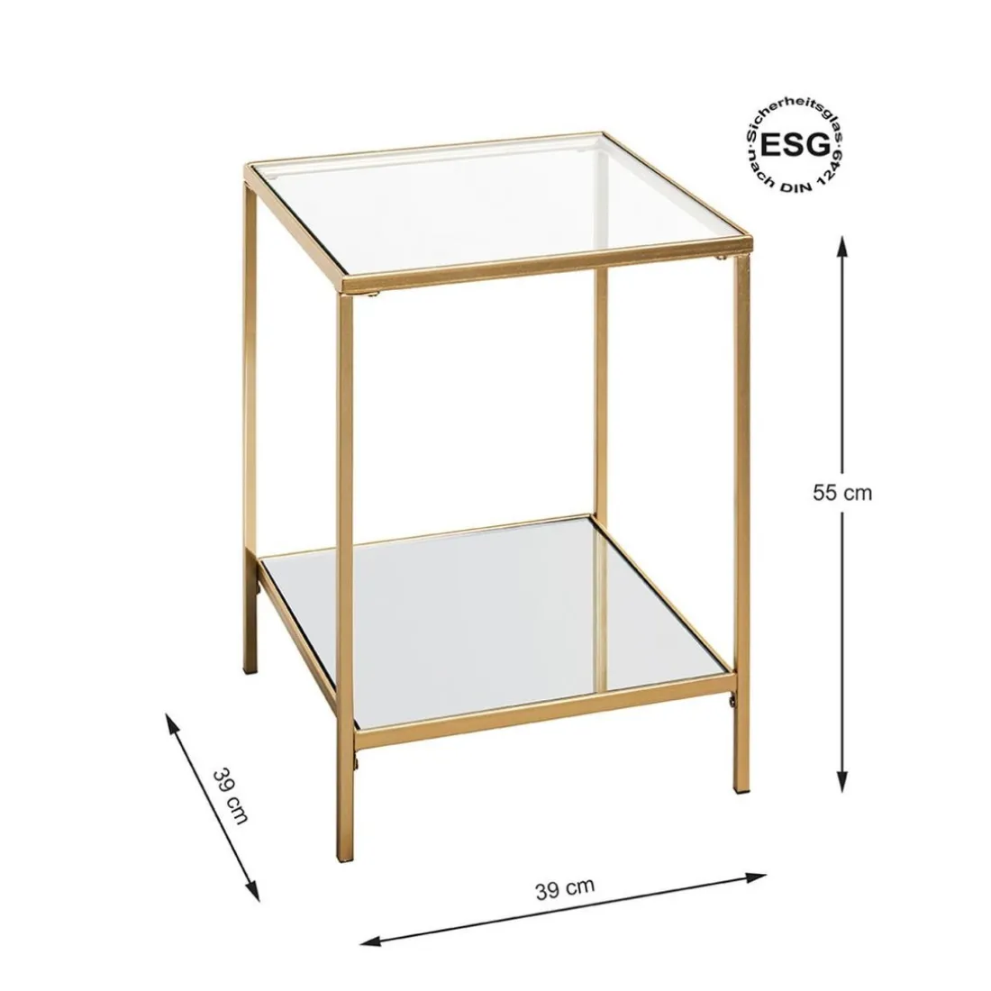 Caractéristiques Table d’appoint carrée acier laqué d’or et plateaux miroir et verre trempé