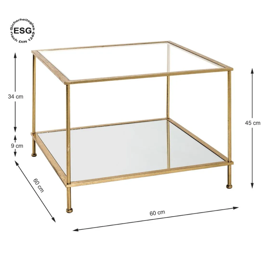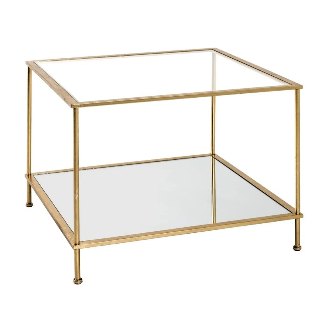 Tube d’acier laqué or, plateau de dessous en miroir, plateau de dessus en verre trempé transparent