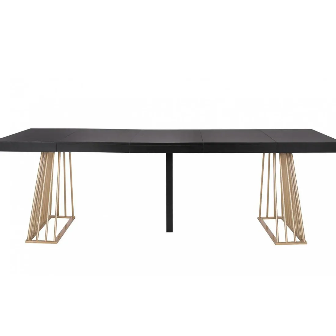 Gagnez de la place tout en décorant votre salle à manger grâce à cette Table à Manger Extensible en Bois Noir EXTENSO au design contemporain chic. Son plateau en bois s’équipent de 3 rallonges pouvant être réglé jusqu’à 240cm pour accueillir 10 convives. Le tout est monté sur une structure en métal doré qui lui donne un style chic et épuré.