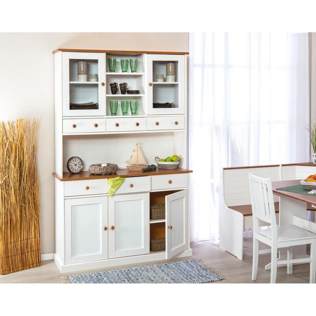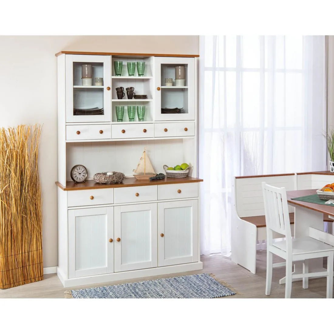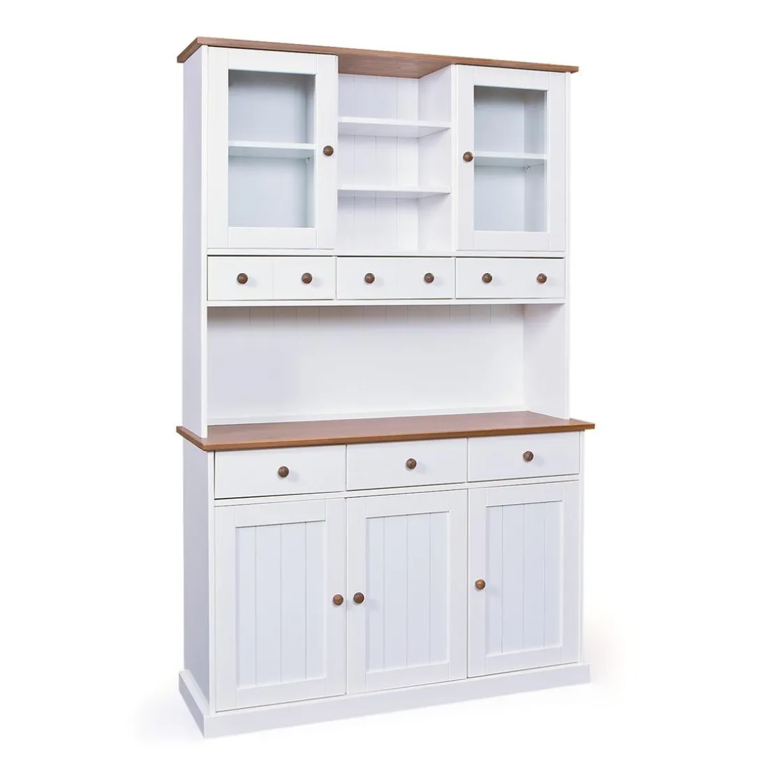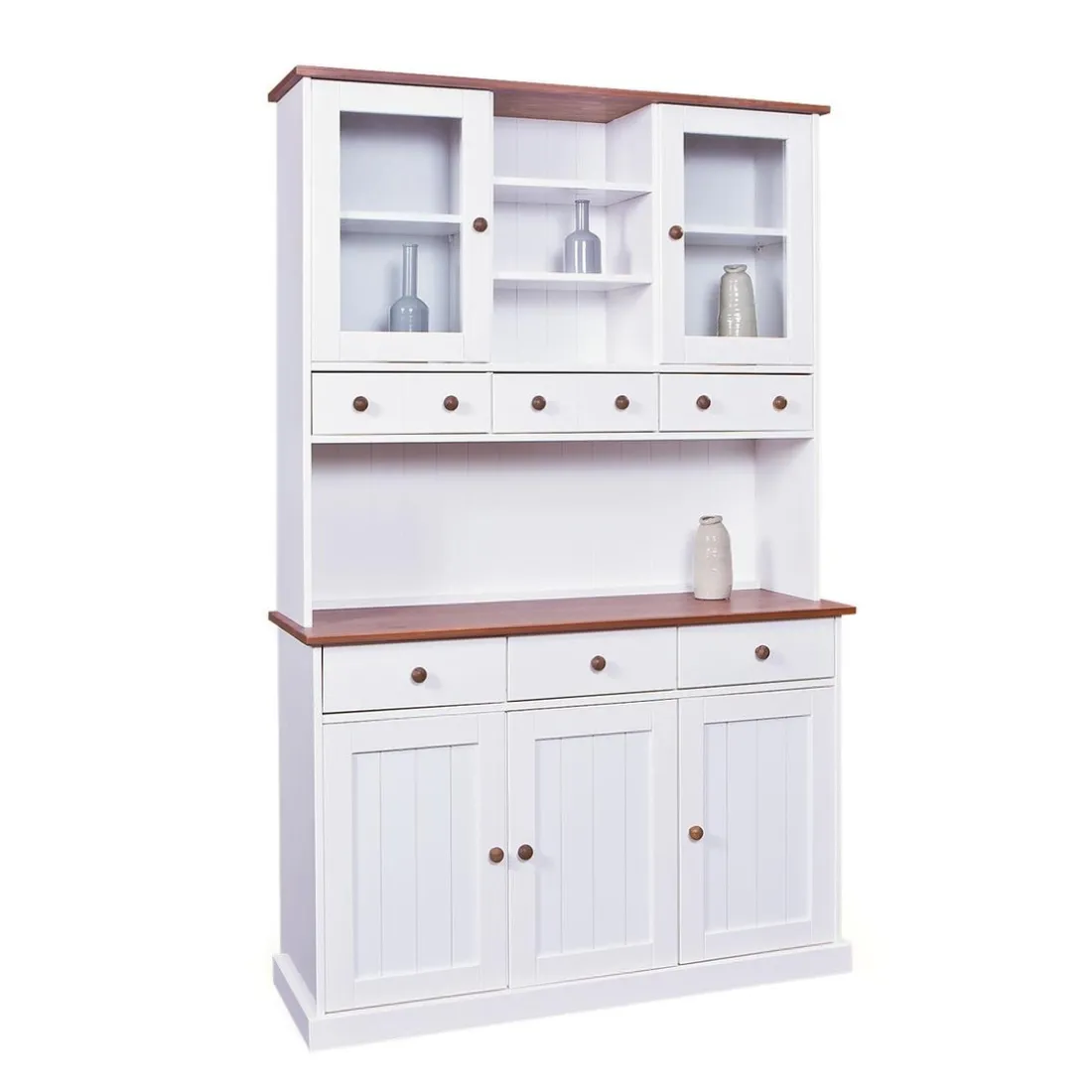 Pour une cuisine ordonnée et joliment décorée, découvrez ce Vaisselier 5 portes en Pin Massif VASSILIO. Il se compose d’une partie haute avec deux vitrines, 3niches et trois tiroirs destiné pour vos vaisselles et couverts. Le bas présente également 3 tiroirs et deux portes renfermant un large espace pour vos linges de maison ou autres accessoires. Son total look blanc se fond dans tous les styles de décoration.
