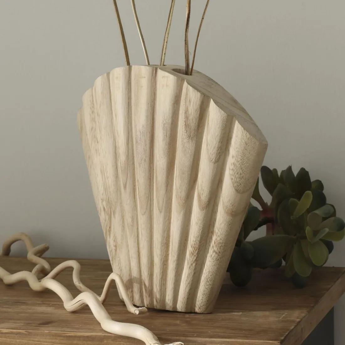 Apportez une touche naturelle et raffinée à votre intérieur avec le vase déco QUICO en bois de paulownia, inspiré par la forme d’un coquillage. Avec ses trois ouvertures façon soliflore, il permet de mettre en valeur fleurs séchées et branchages en toute élégance. Son coloris beige naturel sublime les détails du bois et s’adapte à tous les styles de décoration. À poser sur une table ou une étagère, il se suffit à lui-même en tant qu’objet déco à part entière. Dimensions : 25 x 5 x 25 cm. (Ne pas mettre d’eau.)