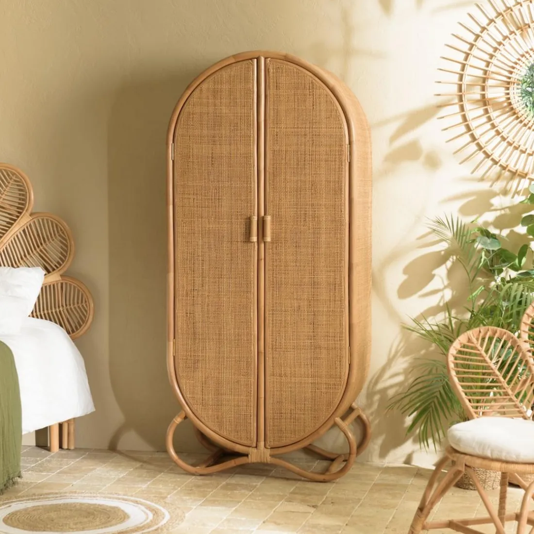L’ Armoire en rotin 2 portes en cannage couleur brun miel KALLY de la marque MACABANE saura apporter une touche Scandicraft à votre intérieur. Avec sa couleur beige neutre, elle s’harmonise facilement avec divers styles de décoration. Elle se caractérise par ses dimensions généreuses, avec une hauteur de 83 cm et une longueur de 183 cm, offrant un espace de rangement optimal. Le détail du cannage sur les portes ajoute une dimension artisanale à cette pièce qui deviendra indéniablement le centre d’attention de votre pièce.