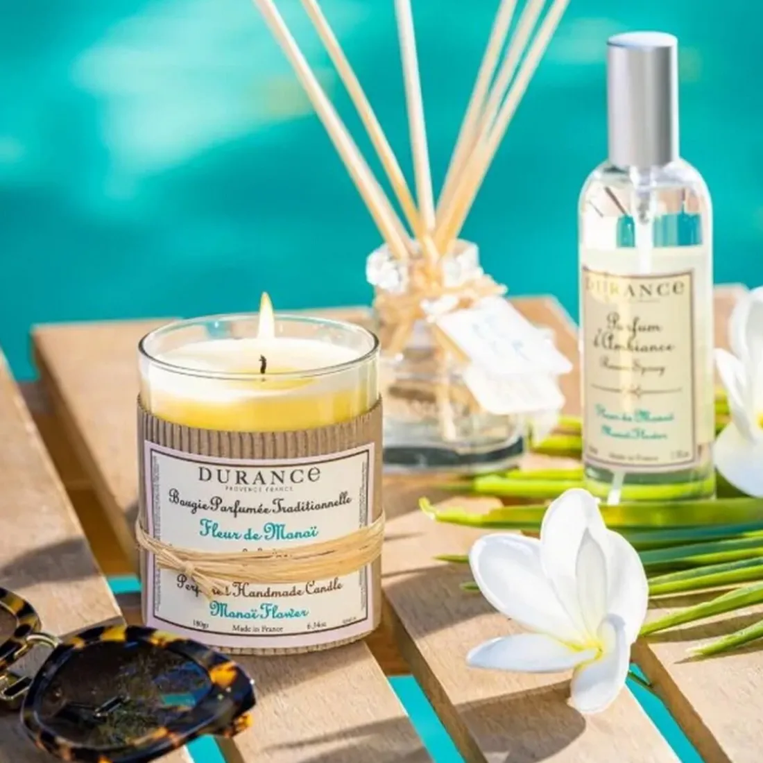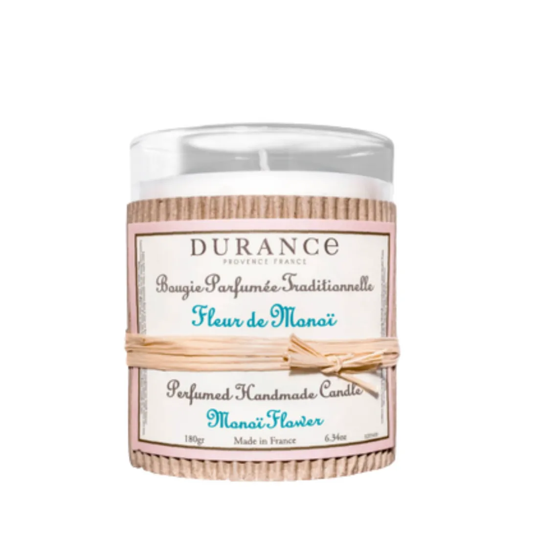 La Bougie Traditionnelle DURANCE Parfum Fleur de Monoi SWANN vous ramènera en vacances avec sa touche fleurie. L’esprit estival embaumera votre salon et vous rappellera vos journées à la plage.