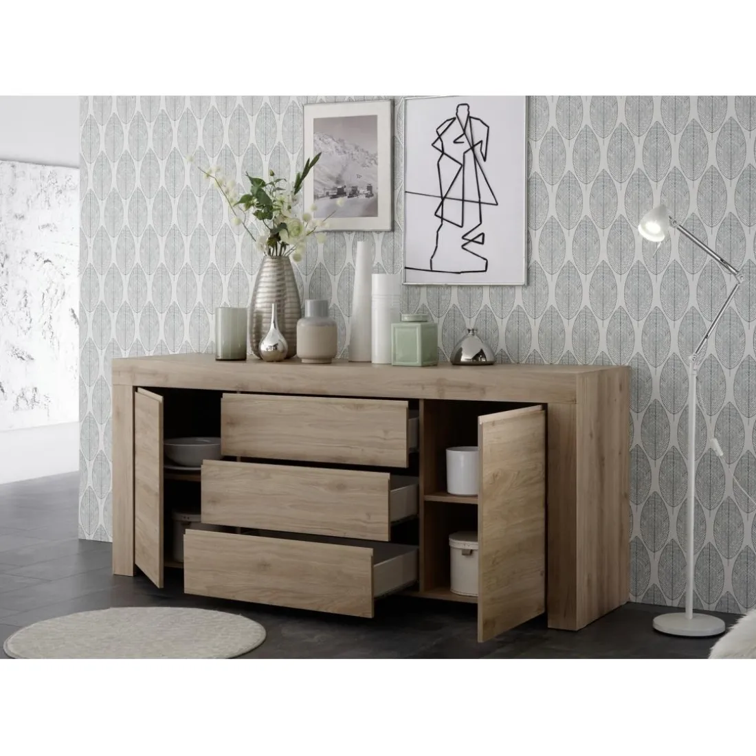 Le buffet FIRENZE de marque 3S. x Home est un ensemble fonctionnel et esthétique de 2 portes et 3 tiroirs. Présenté en bois avec un sublime décor chêne clair, il apporte une atmosphère authentique à votre intérieur. Le design de chaque tiroir, accompagné d’une poignée contrastée, rehausse subtilement le look global. C’est un vaisselier par excellence pour une agréable rencontre de l’urbain et de la rusticité.