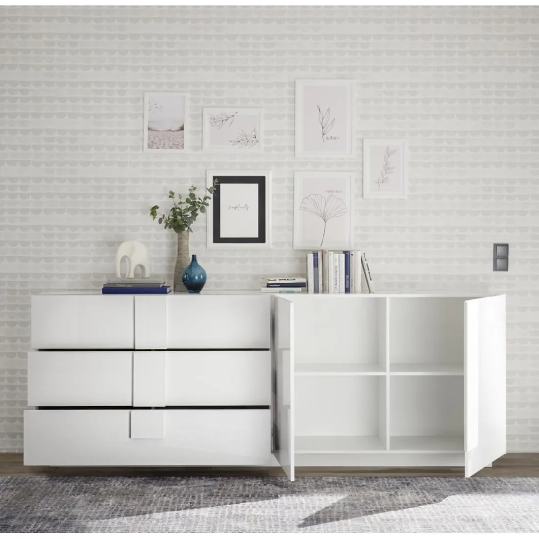 Caractéristiques Buffet 3 tiroirs 2 portes blanc laqué brilliant