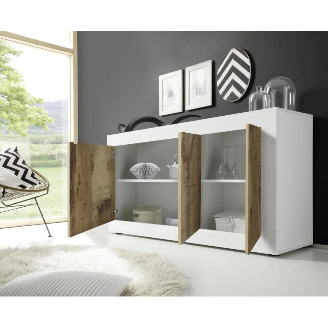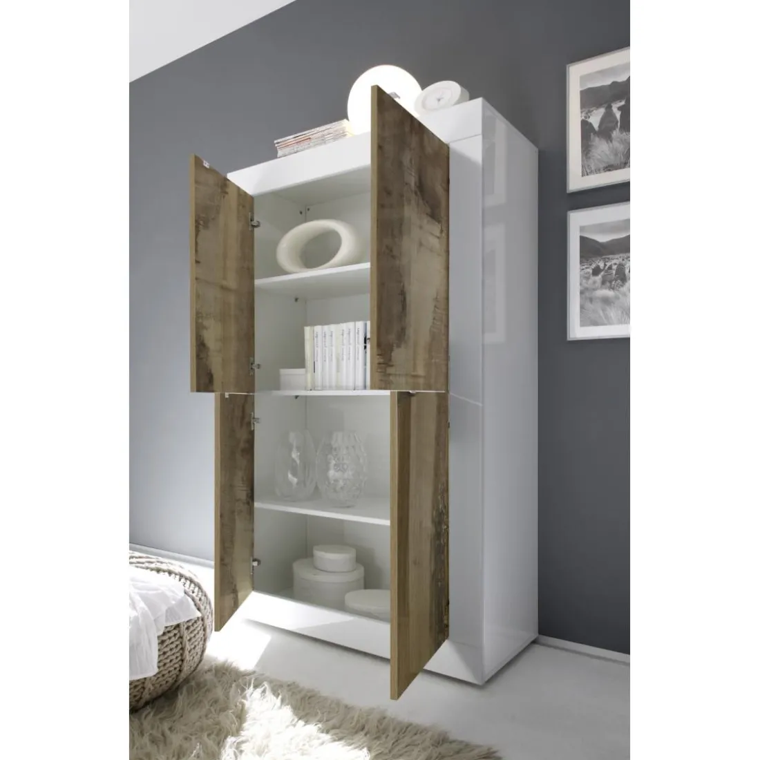 Caractéristiques Buffet haut 4 portes en bois blanc et décor chene pero