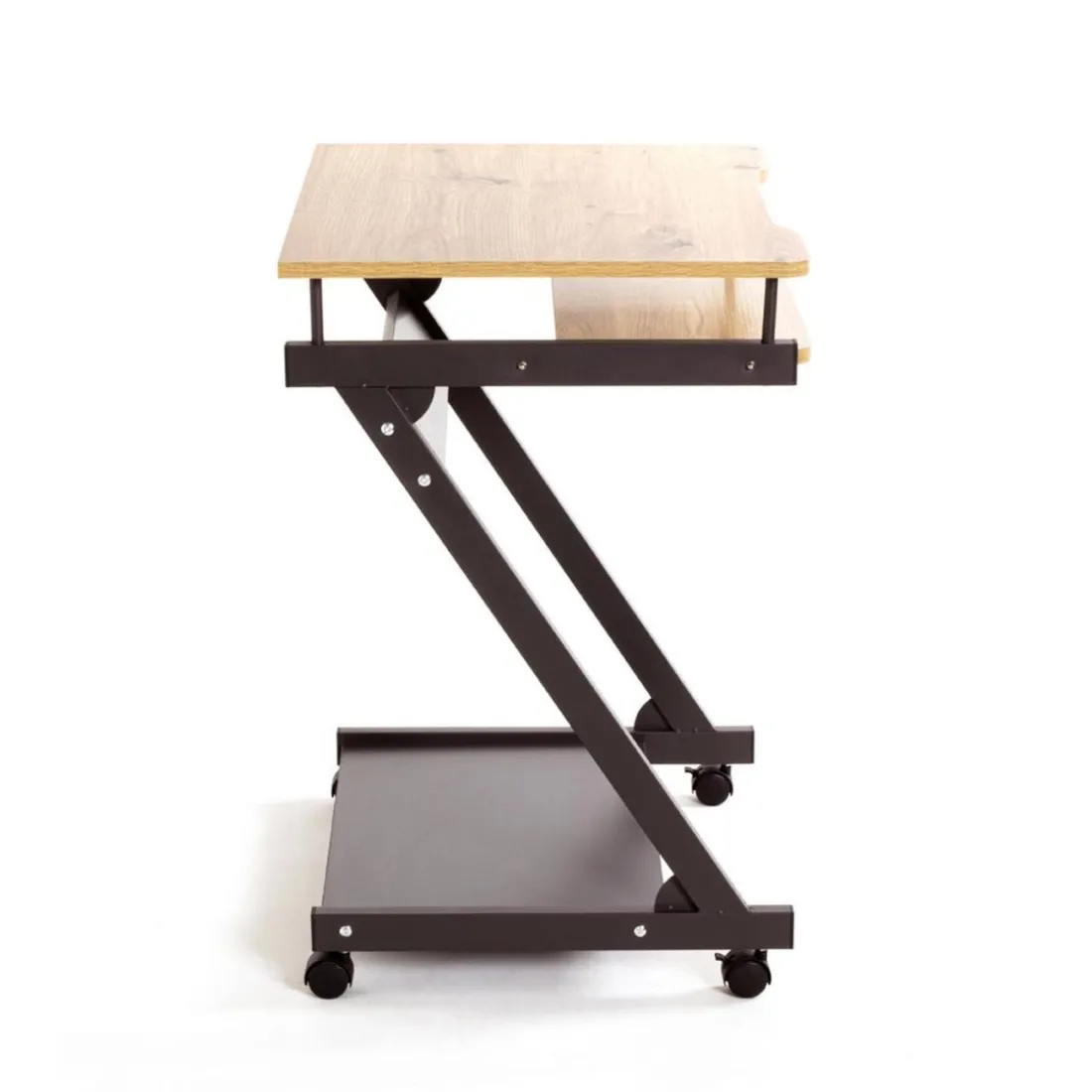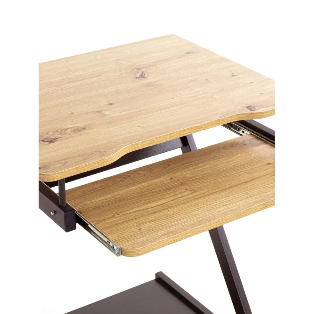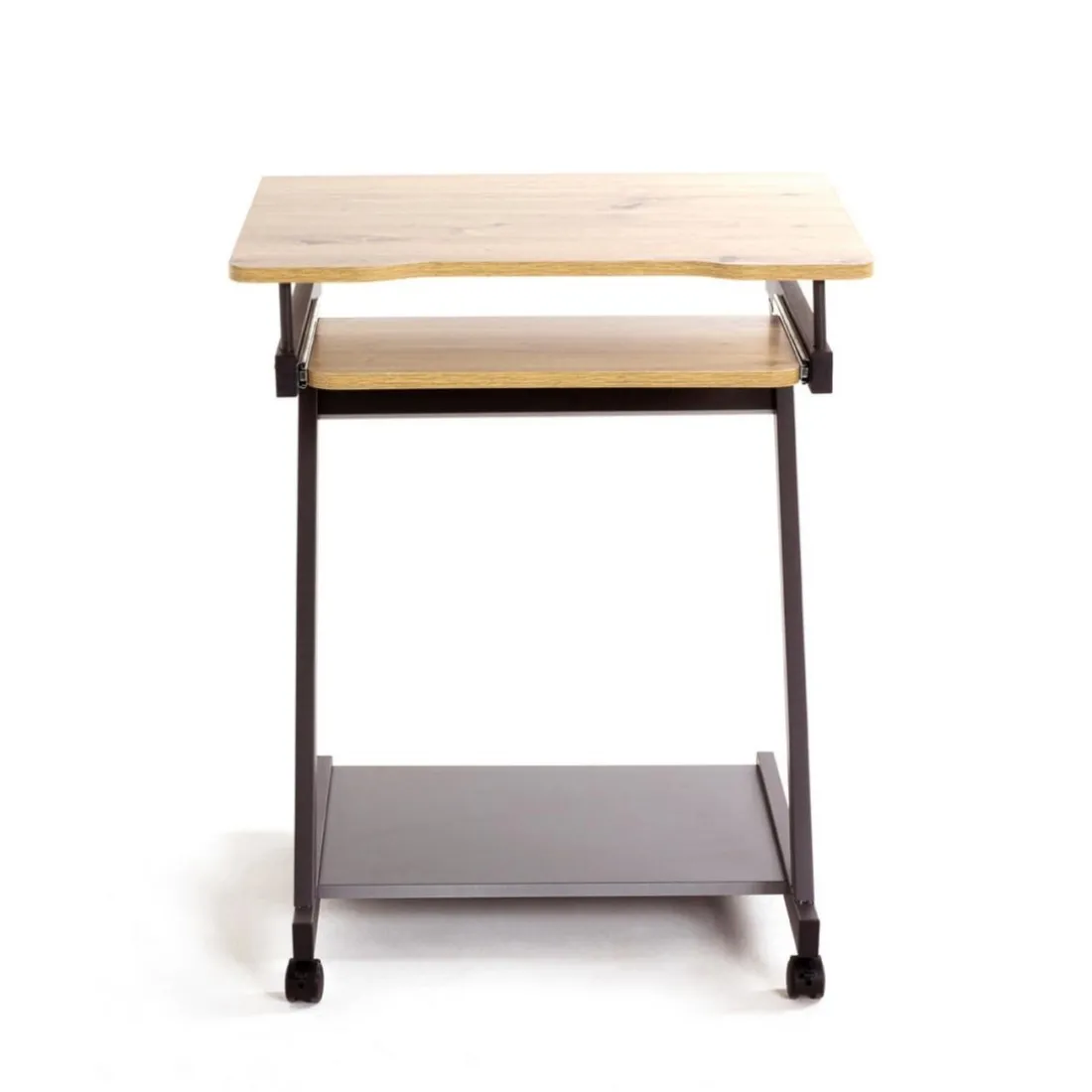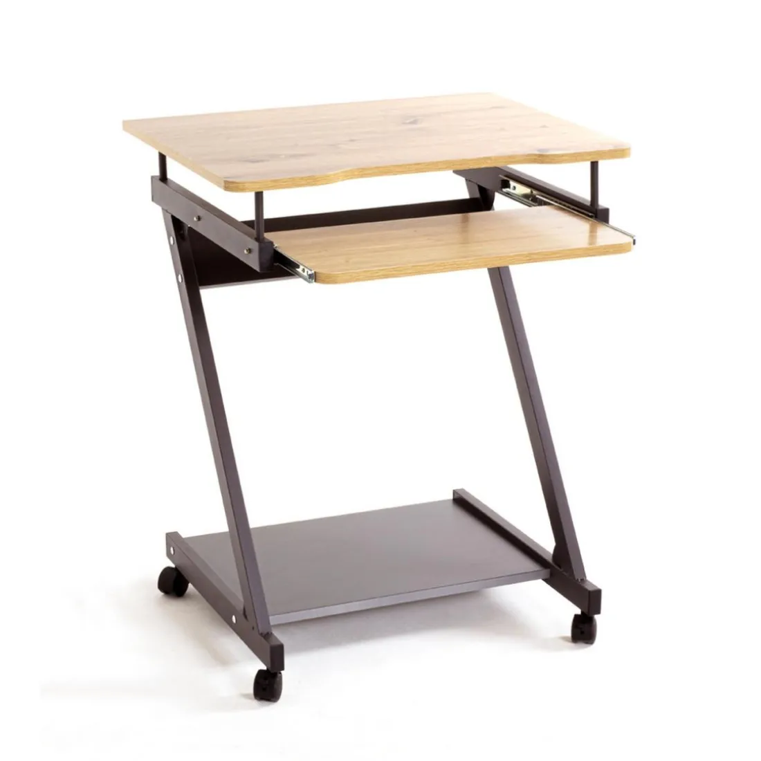 en tube d’acier laqué anthracite, support clavier extensible par glissières à roulements à billes, plateaux en MDF mélamine anthracite et chêne, 2 roulettes freinées