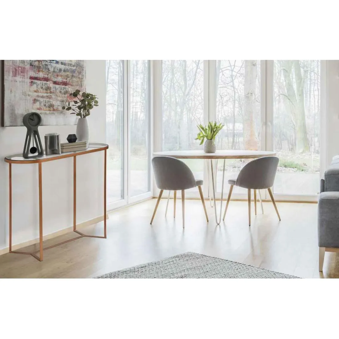 Raffinée et décorative, cette Console Verre Et Métal Cuivré trouve sa place à l’entrée comme dans le salon. Elle se compose d’un plateau rectangulaire avec des côtés arrondis et une structure en métal cuivré tendance.
