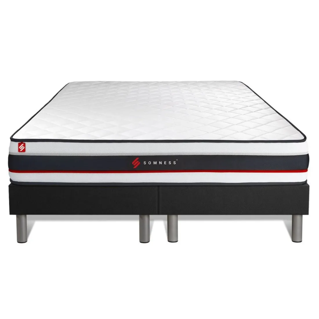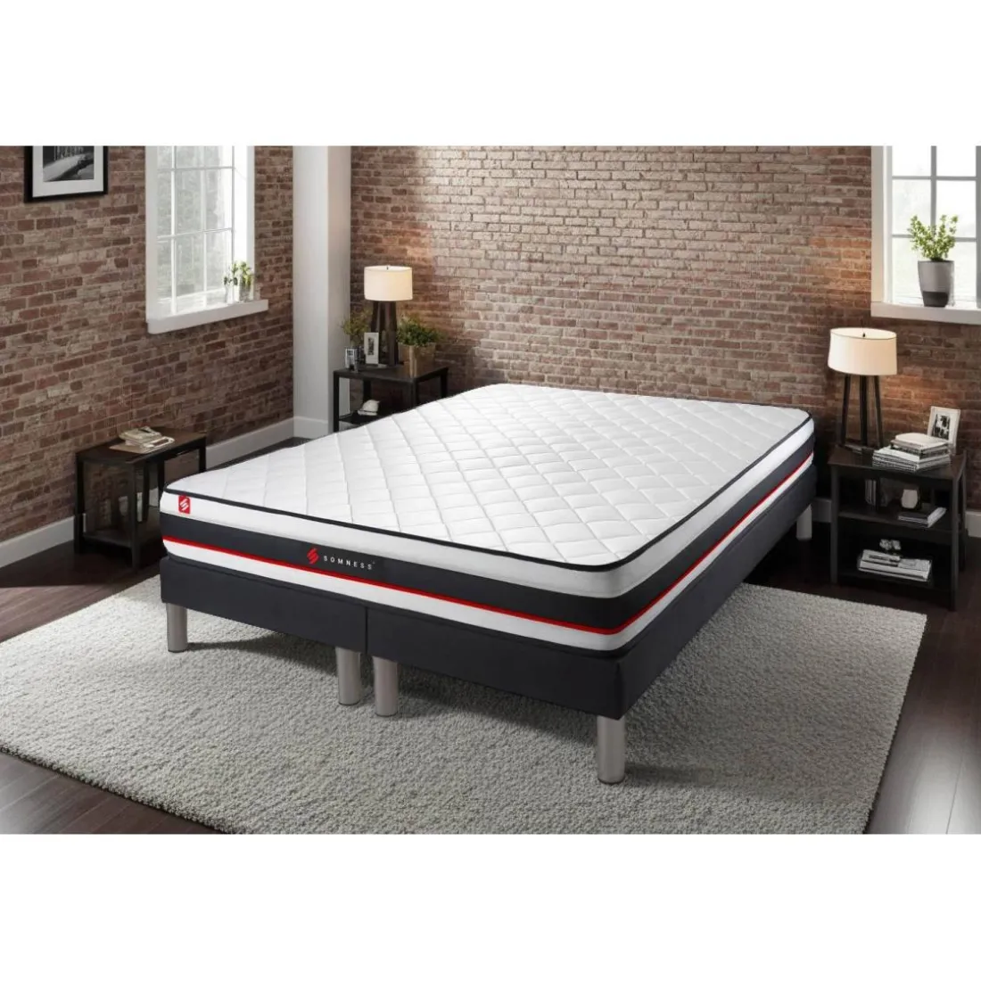 Découvrez l’ensemble double sommier matelas de la marque Somness, une solution de sommeil complète qui combine confort et style. Noir, élégant et intemporel, cet ensemble se distingue par sa finition impeccable. Confectionné en tissu, le sommier et le matelas sont tous deux incroyablement durables et résistants. Le style authentique ajoute une touche de caractère tout en restant suffisamment neutre pour se fondre facilement dans n’importe quel décor. Sur l’image, on peut apprécier la haute qualité de la couture et le design soigné qui caractérisent aussi bien le matelas que le sommier. Prenez votre sommeil au sérieux avec Somness.