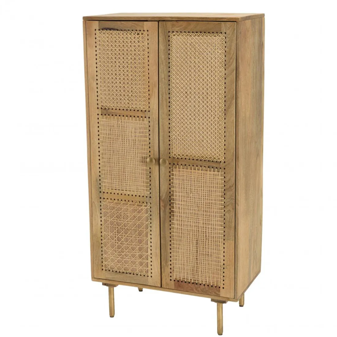 Meuble haut marron 2 portes bois de manguier cannage couleur naturelle Tombez sous le charme de ce sublime meuble haut en bois de manguier et rotin. Composé de différents types de cannage sur ses deux portes, il est original et sa hauteur lui donne une certaine élégance. Ses pieds et ses poignées dorées sont également très chics. Doté de plusieurs étagères et compartiments, vous pouvez tout à fait l’utiliser comme une armoire pour y ranger vos vêtements.