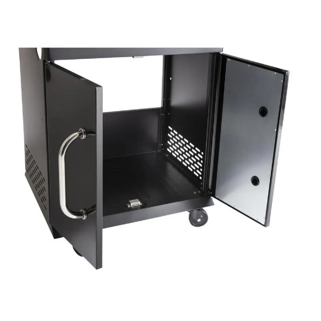 Module évier 100 % métal avec crédence en noir et inox avec espace de rangement fermé par des portes et 4 roues multidirectionnelles.