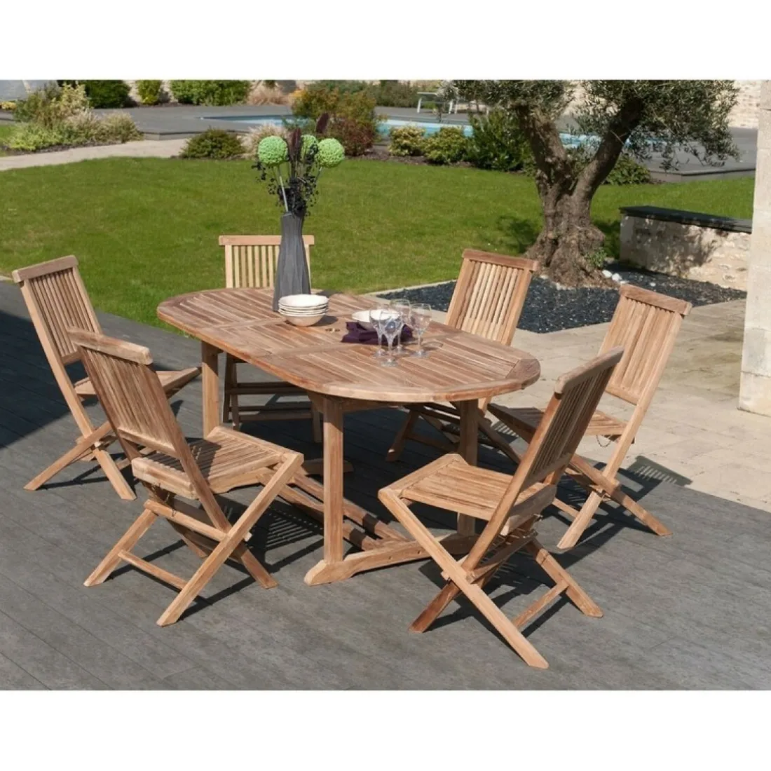 SALON DE JARDIN EN BOIS TECK 6/8 pers : Ensemble de jardin : 1 table ovale extensible 150*200/90cm et 6 chaises