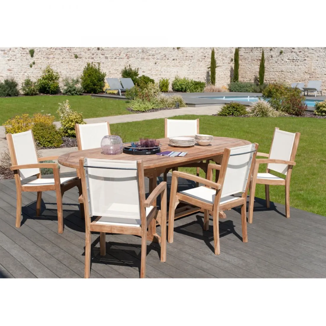 Caractéristiques Ensemble table ovale extensible + 6 fauteuils empilables en teck massif et textile