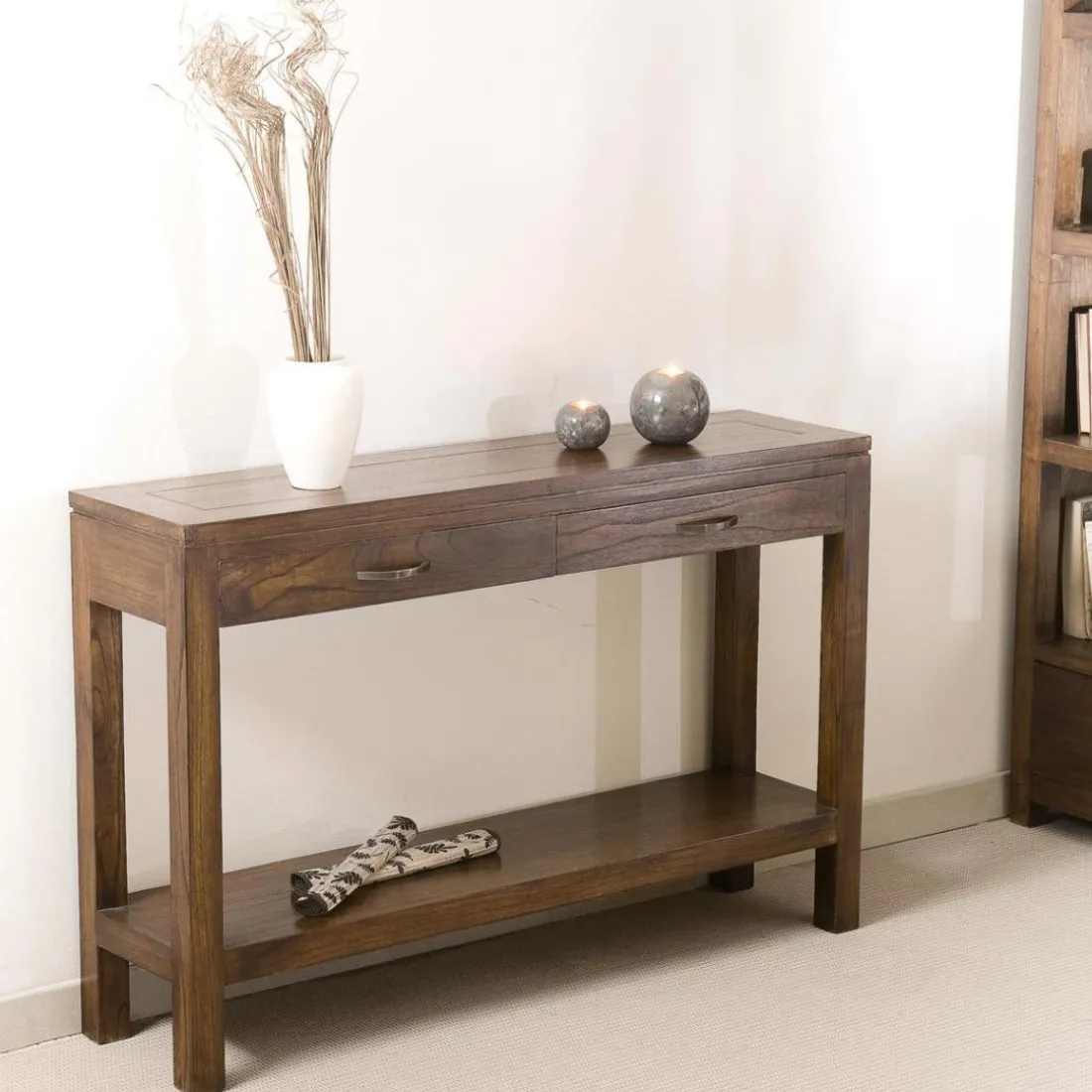 Console rectangulaire 2 tiroirs en bois mindi livrée montée