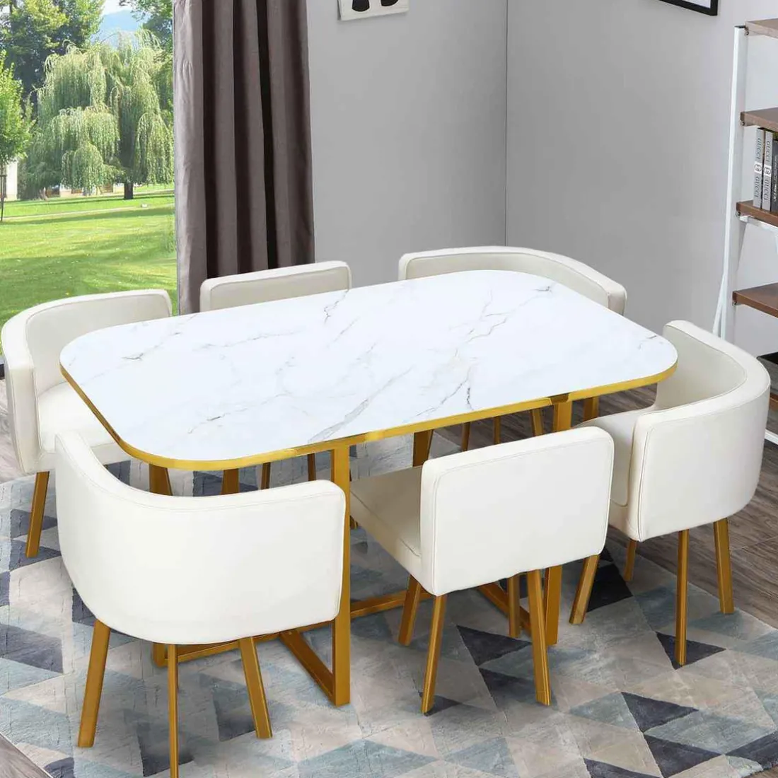 Caractéristiques Table Et Chaises OSLO XL Or Effet Marbre Blanc et Simili Blanc