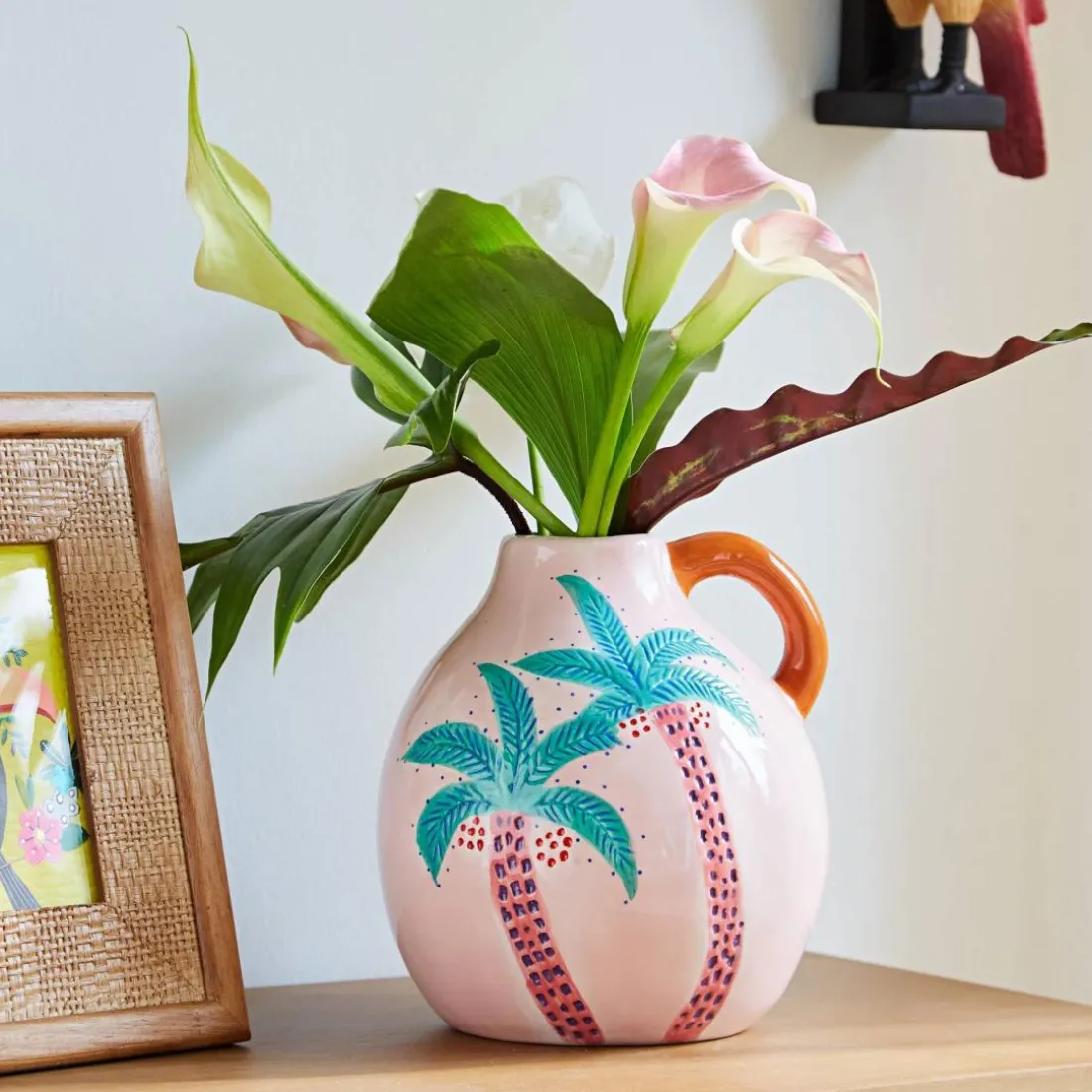 Oui, les vases peuvent être également décoratifs ! Celui-ci en est la démonstration, avec sa forme de cruche joliment décorée de palmiers. Ce vase cruche est à lui seul un bel objet déco, une note exotique et colorée qui met du soleil dans la maison ! On craque pour son motif un peu naïf et ses jolies couleurs pastel. En céramique, motifs palmier en relief. Anse. Dim. 18 x 18 x h. 19 cm.